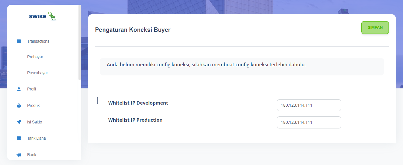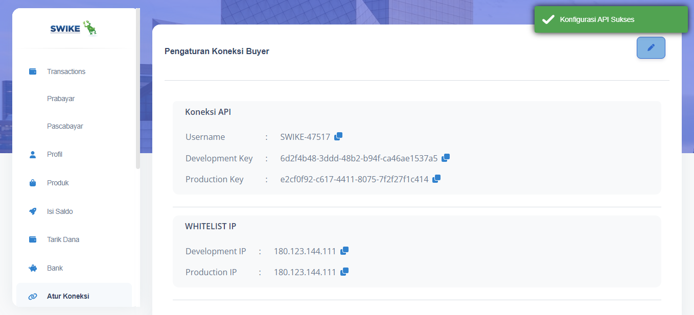 Konfigurasi Koneksi API pada menu Koneksi API pada Marketplace SWIKEE.