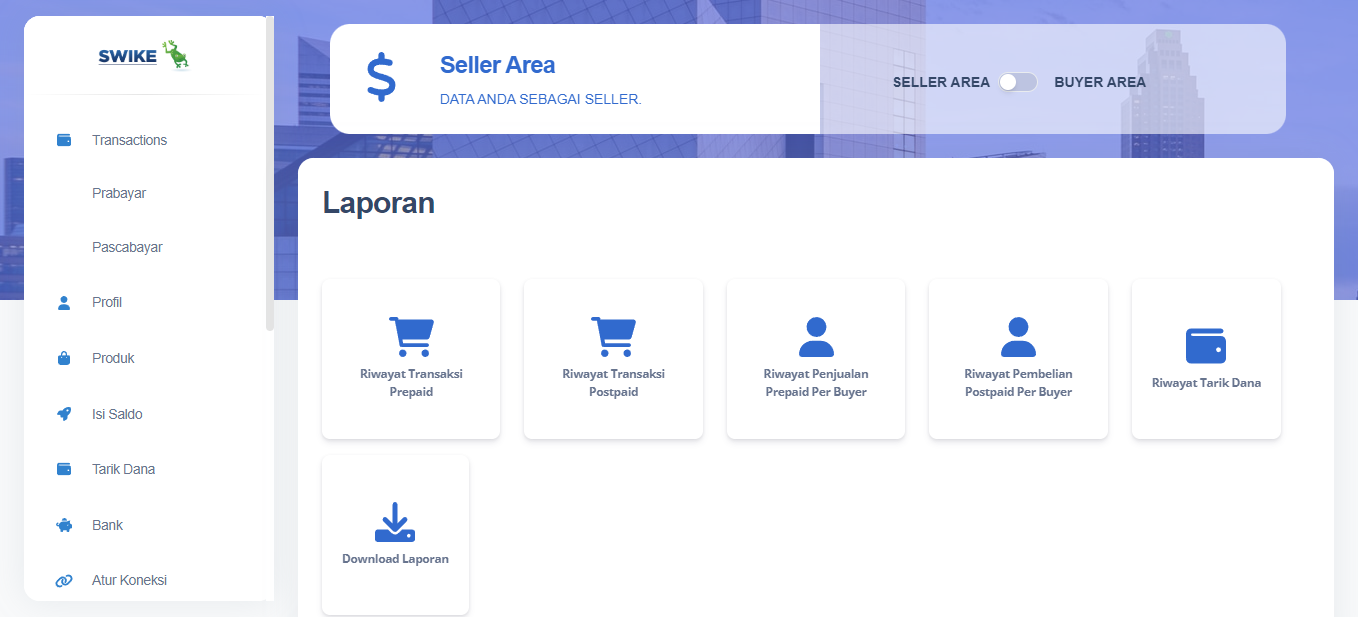 Apabila anda mengklik pada menu Laporan, anda dapat melihat beberapa tombol. Tombol seperti Laporan Penjualan/Pembelian Prabayar dan Laporan Penjualan/Pembelian Pascabayar akan mengarahkan anda pada halaman transaksi. Tombol Riwayat Isi Saldo akan mengarahkan anda pada halaman Isi Saldo, dan Tombol Riwayat Tarik Dana akan mengarahkan anda pada halaman Tarik Dana.