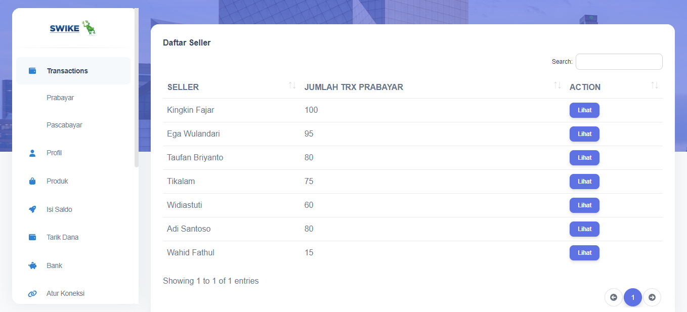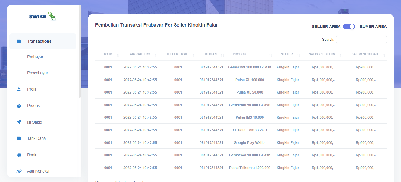 Untuk melihat laporan penjualan prabayar per buyer, klik pada tombol Laporan penjualan prabayar per buyer, akan ditampilkan daftar buyer yang pernah bertransaksi dengan anda.