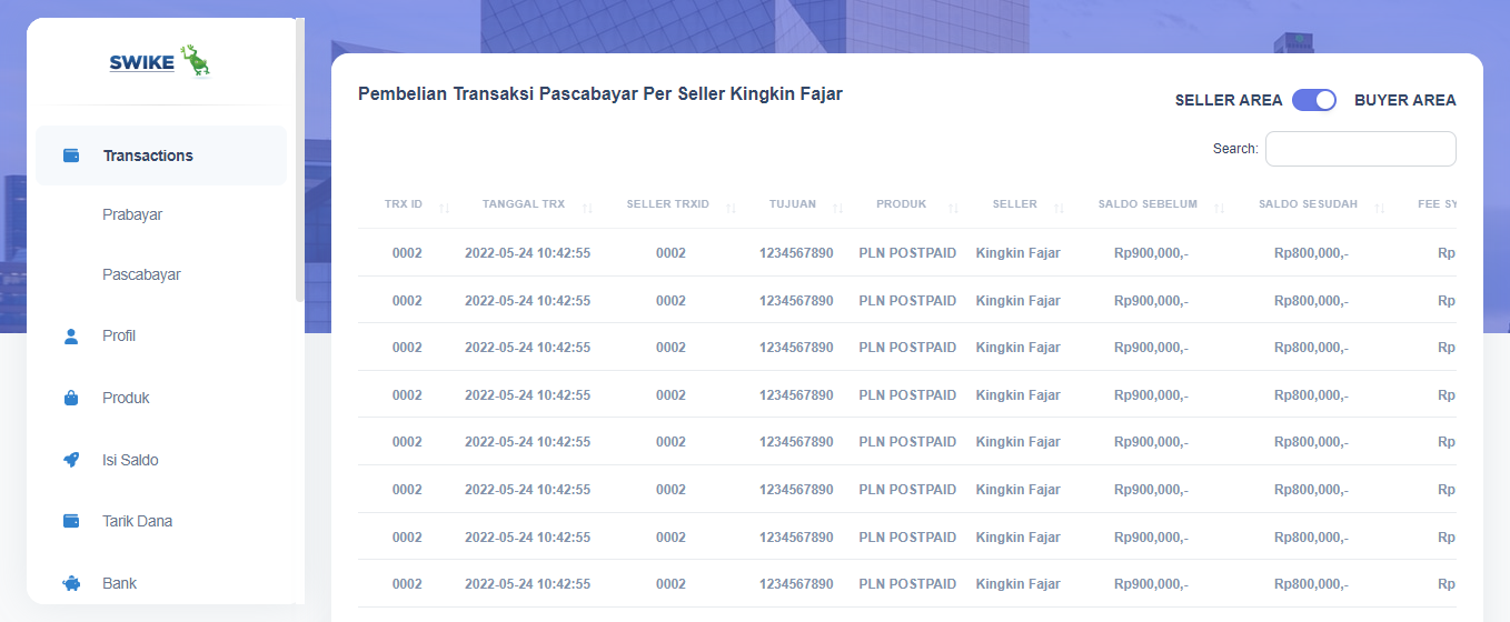 Untuk melihat laporan penjualan pascabayar per buyer, klik pada tombol Laporan penjualan pascabayar per buyer, akan ditampilkan daftar buyer yang pernah bertransaksi dengan anda.